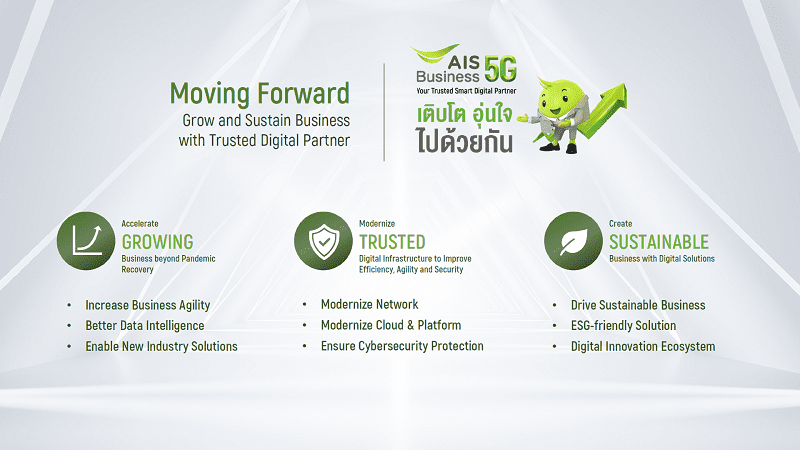 Sustainability : Creating Sustainable Business with Digital Solutions สร้างระบบนิเวศนวัตกรรมเพื่อธุรกิจอย่างยั่งยืน เอไอเอส บิสสิเนส พร้อมเป็นส่วนหนึ่งในกลไกสำคัญที่ช่วยเสริมนวัตกรรมเพื่อการเติบโตอย่างยั่งยืน ครอบคลุมทั้งมิติเศรษฐกิจ สังคม และสิ่งแวดล้อม