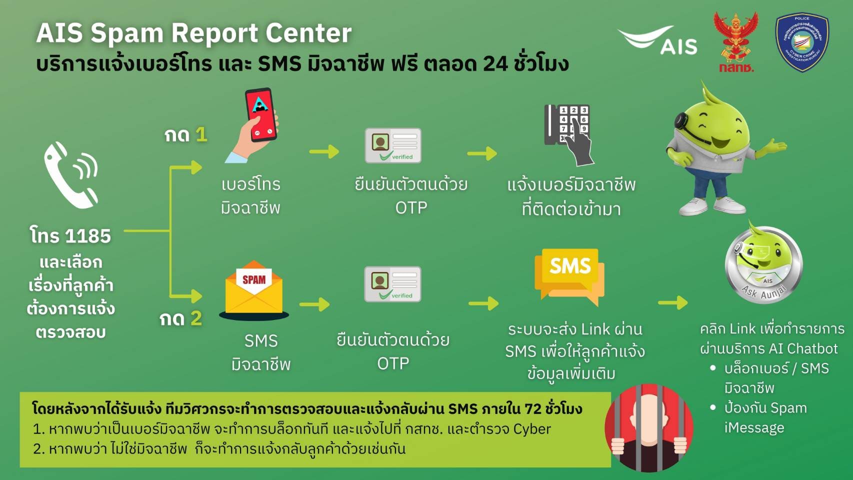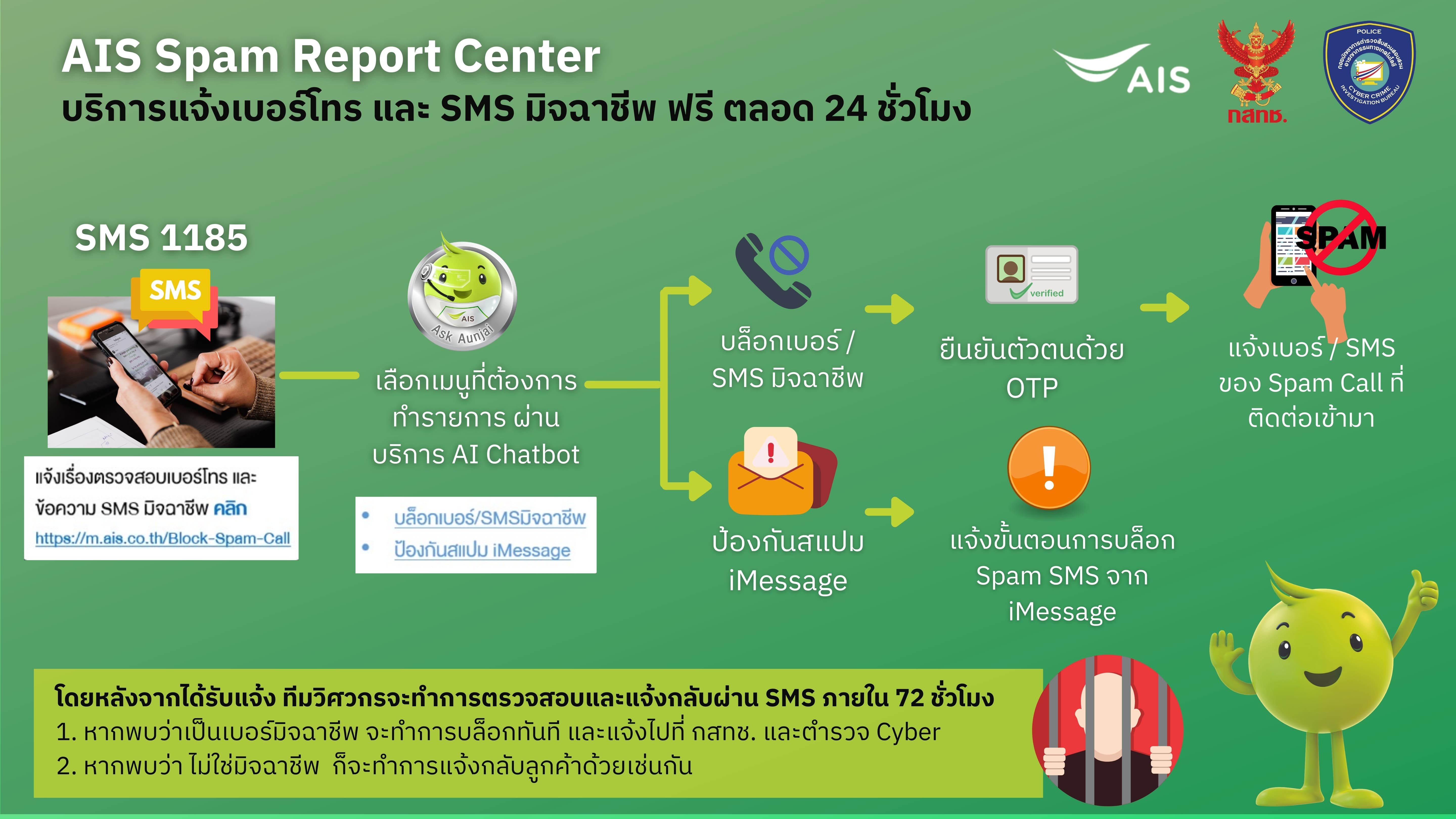 อันจะนำมาซึ่งการติดตาม ตรวจสอบ แก้ปัญหาแบบถอนรากถอนโคนอีกด้วย ดังนั้นครั้งนี้จึงเป็นก้าวสำคัญที่จะยืนยันถึงเจตนารมณ์ของเราที่จะให้ เอไอเอส เป็นเครือข่ายปลอดภัยของคนไทย เราจึงเปิดตัว สายด่วน 1185 ศูนย์รับเรื่องร้องเรียนเบอร์โทร และ SMS มิจฉาชีพ หรือ AIS Spam Report Center