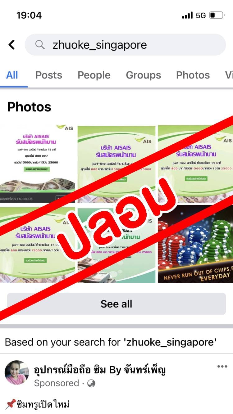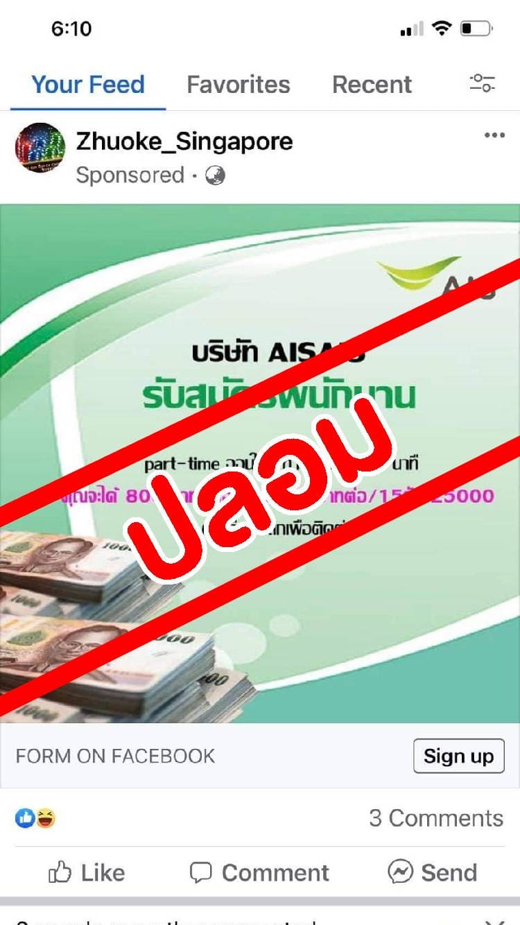 จากกรณีที่กลุ่มมิจฉาชีพได้มีการส่งต่อ link และรูปภาพการรับสมัครงาน โดยแอบอ้างชื่อ เอไอเอส ผ่านทาง online อาทิ เฟสบุ๊ค ในหลากหลายรูปแบบในช่วงที่ผ่านมานั้น