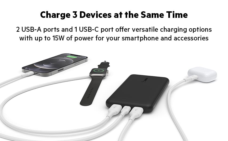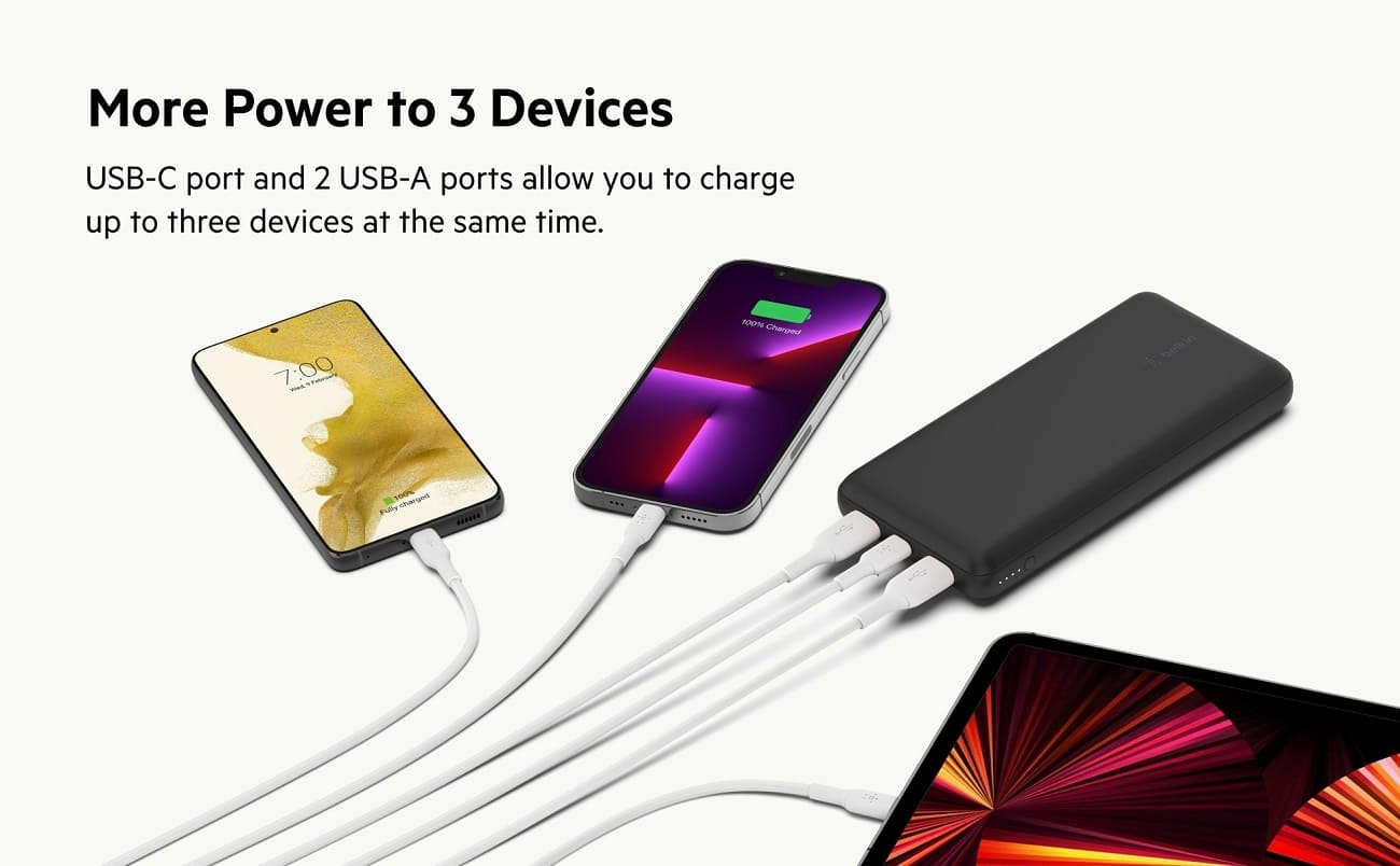 จุดเด่นของ BoostCharge 3–Port Power Bank 10K + USB–A to USB–C Cable
