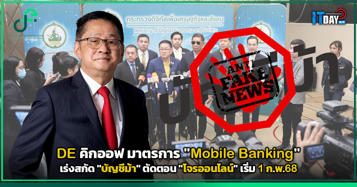 กระทรวงดิจิทัลเพื่อเศรษฐกิจ และสังคม หรือ ดีอี (DE) คิกออฟ มาตรการ “Mobile Banking” เร่งสกัด “บัญชีม้า” ตัดตอน “โจรออนไลน์” เริ่ม 1 ก.พ.68…