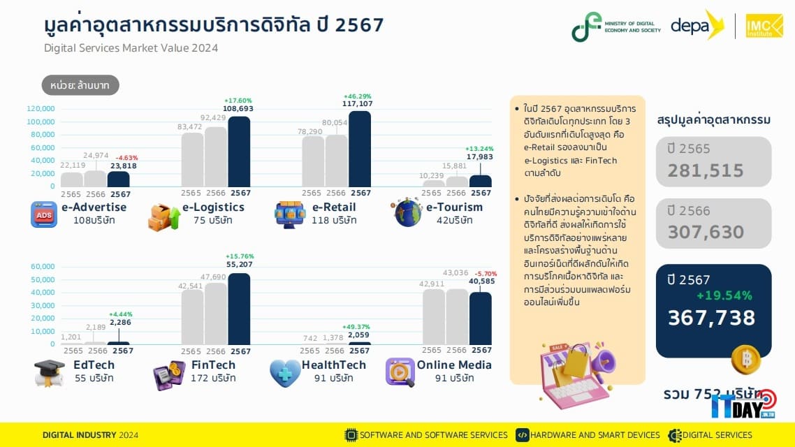 อุตสาหกรรมบริการดิจิทัล ปี 2567 มีมูลค่ารวม 367,738 ล้านบาท เติบโตจากปีก่อน 19.54% มีปัจจัยหนุนมาจากความต้องการใช้บริการดิจิทัลที่เพิ่มขึ้นอย่างต่อเนื่อง โดยเฉพาะบริการ e-Retail ที่มีมูลค่า 117,107 ล้านบาท เติบโตสูงถึง 46.29% ส่วนบริการ e-Logistics มีมูลค่า 108,693 ล้านบาท เติบโต 17.60%