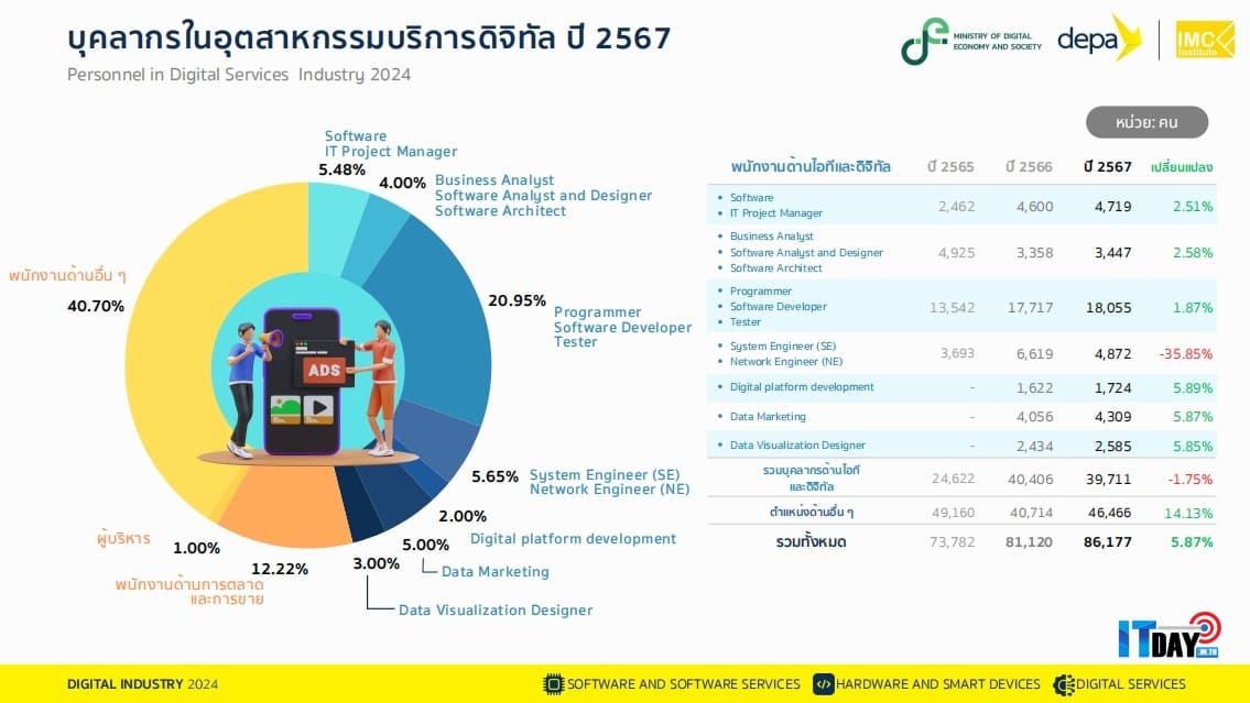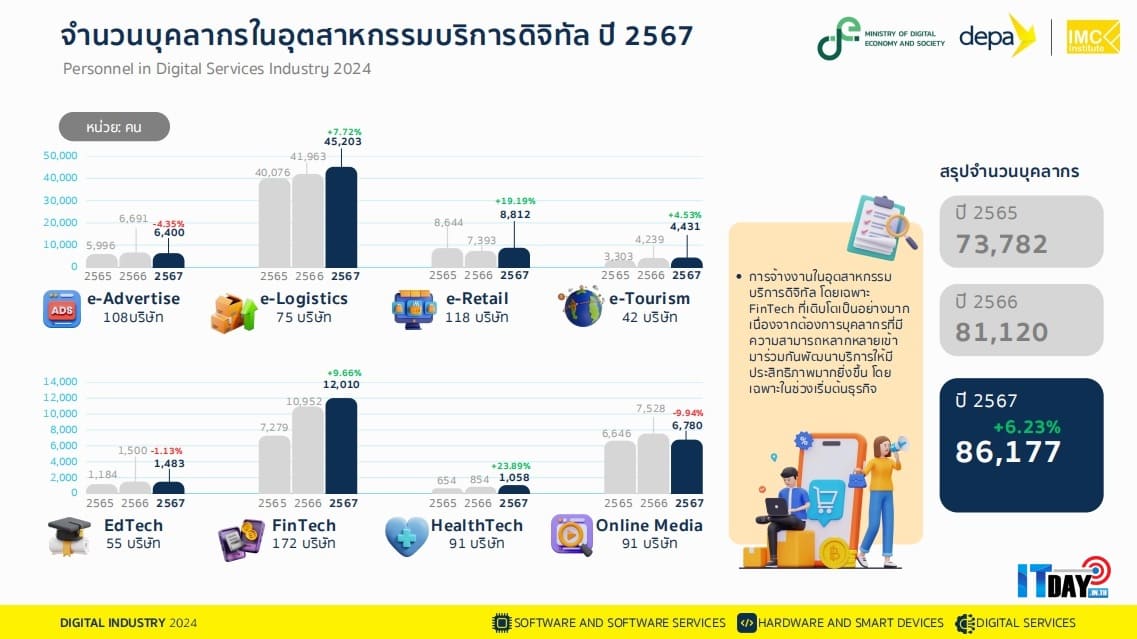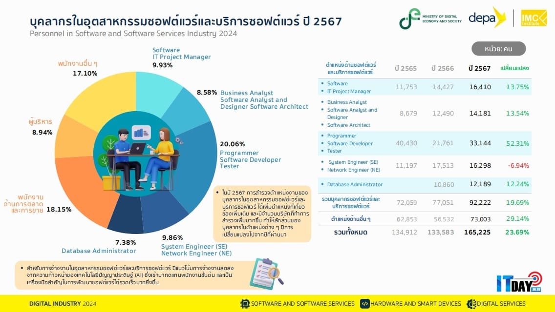 ในส่วนของบุคลากรดิจิทัลในภาพรวมยังคงเติบโต โดยการสำรวจพบว่าอุตสาหกรรมซอฟต์แวร์มีบุคลากรเพิ่มขึ้นถึง 23.77% มีจำนวน 175,254 คน ขณะที่อุตสาหกรรมบริการดิจิทัลมีบุคลากร 86,177 คน เติบโต 6.23% อุตสาหกรรมฮาร์ดแวร์ และอุปกรณ์อัจฉริยะมีบุคลากร 305,875 คน ลดลง 5.05% โดยมีสาเหตุสำคัญ