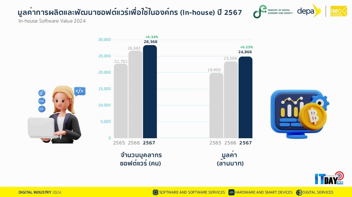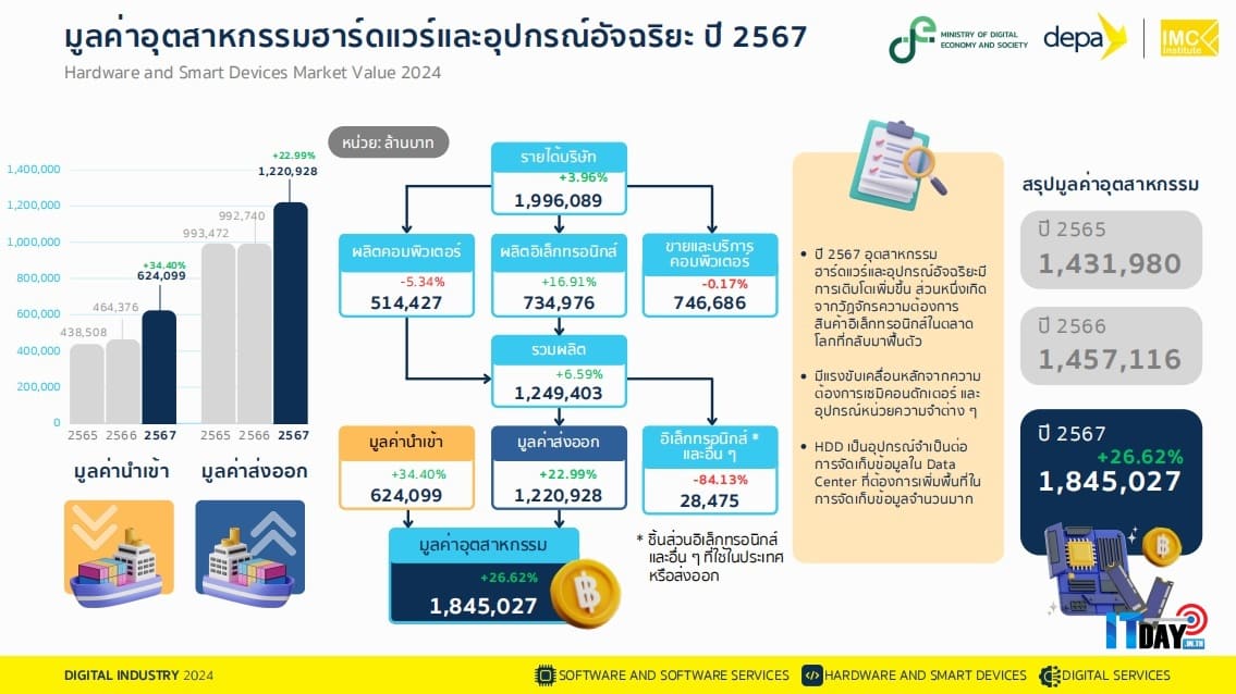 โดยการสำรวจข้อมูล และประเมินสถานภาพอุตสาหกรรมดิจิทัล ประจำปี 2567 พบว่า ภาพรวมขยายตัวจากปีก่อนหน้าถึง 23.35% มีมูลค่ารวมอยู่ที่ 2,496,760 ล้านบาท โดยอุตสาหกรรมที่ขยายตัวสูงที่สุดคือ อุตสาหกรรมฮาร์ดแวร์ และอุปกรณ์อัจฉริยะที่มีอัตราการเติบโต 26.62% มีมูลค่า 1,845,027 ล้านบาท ร