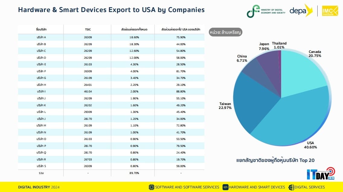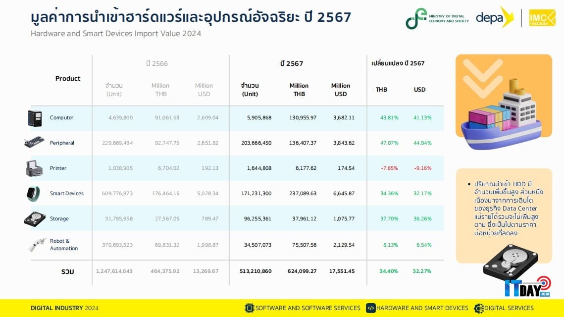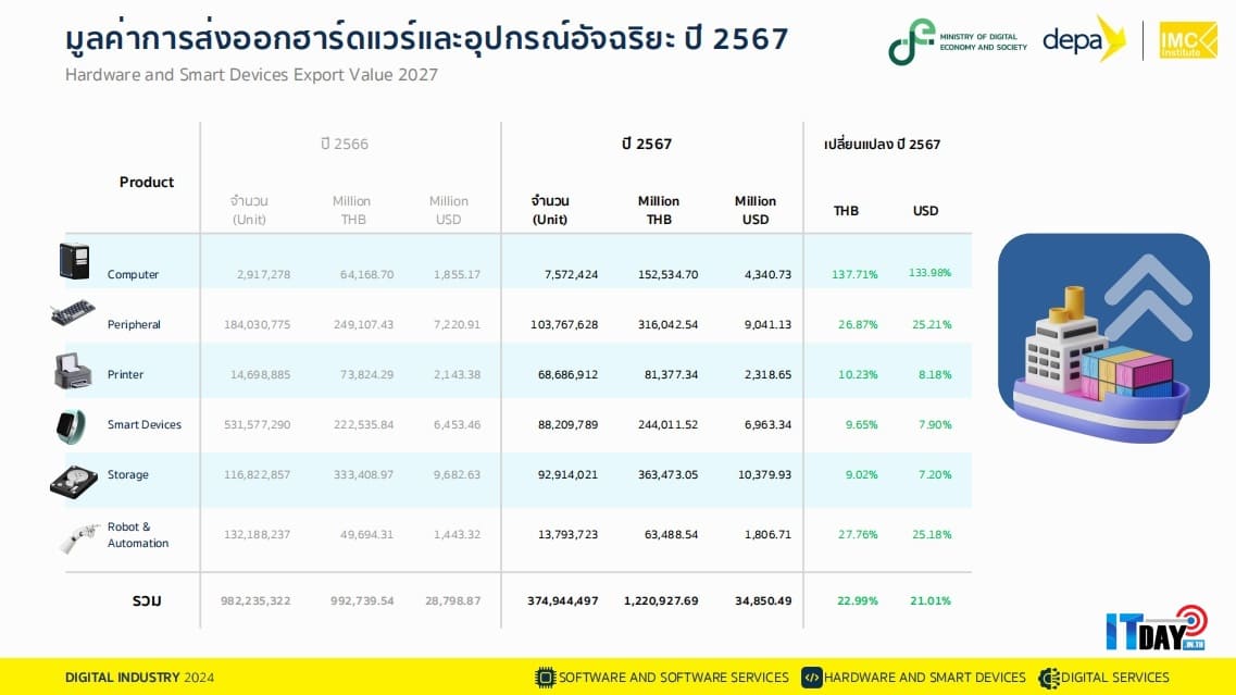 - ดีป้า ร่วมกับ สถาบันไอเอ็มซี เผยผลสำรวจข้อมูล และประเมินสถานภาพอุตสาหกรรมดิจิทัล ประจำปี 2567 และคาดการณ์แนวโน้ม 3 ปี ระบุภาพรวมอุตสาหกรรมขยายตัวถึง 23.35% คิดเป็นมูลค่ารวมกว่า 2.496 ล้านล้านบาท โดยอุตสาหกรรมฮาร์ดแวร์ และอุปกรณ์อัจฉริยะขยายตัวสูงสุดที่ 26.6% พร้อมวิเคราะห์ผลกระทบจากการขึ้นภาษีนำเข้าของสหรัฐอเมริกา และชี้โอกาสของอุตสาหกรรมดิจิทัลไทยท่ามกลางการแข่งขันระหว่างสองขั้วอำนาจโลก