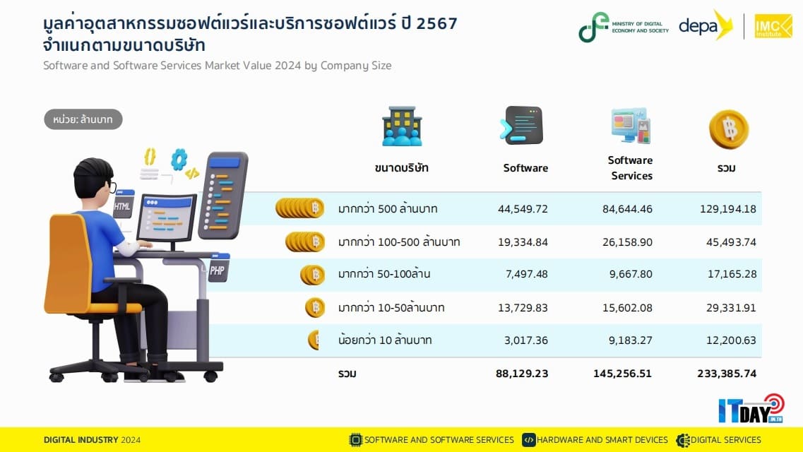 สำหรับอุตสาหกรรมซอฟต์แวร์ แม้จะมีอัตราการเติบโตไม่สูงมากที่ 8.46% แต่มีมูลค่ารวมอยู่ที่ 233,386 ล้านบาท โดยแบ่งเป็น ซอฟต์แวร์ มีมูลค่า 88,129 ล้านบาท เติบโต 8.26% ขณะที่บริการซอฟต์แวร์