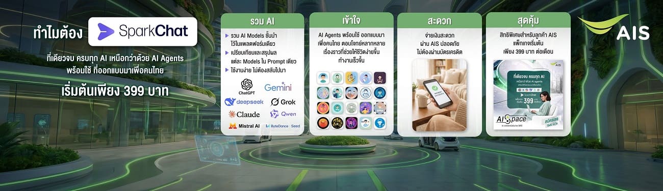 - SparkChat ศูนย์รวม AI Models ชั้นนำทั่วโลกไว้ในที่เดียว ใช้เปรียบเทียบผลลัพธ์และมีระบบแนะนำโมเดลที่เหมาะกับงาน เช่น เขียน, กราฟิก, วิดีโอ, วิเคราะห์ข้อมูล พร้อม AI Agents เพื่อคนไทย ช่วยให้ทำงานไวขึ้น ชำระผ่าน เอไอเอส ได้ปลอดภัย ไม่ต้องใช้บัตรเครดิต พิเศษสำหรับลูกค้า เอไอเอส เริ่มต้น 399 บาทต่อเดือน (จากปกติ 599 บาทต่อเดือน) เริ่มสมัครบริการได้ตั้งแต่วันที่ 18 ก.พ. 69 เป็นต้นไป