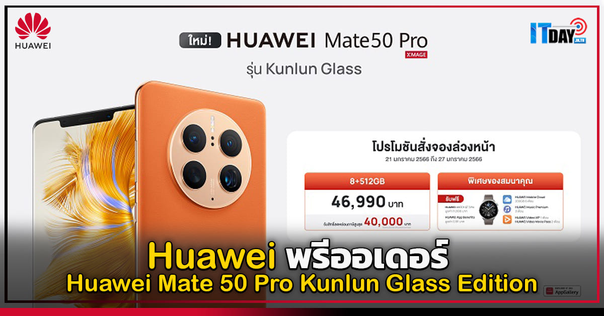 หัวเว่ย พรีออเดอร์ Huawei Mate 50 Pro Kunlun Glass Edition สุดแกร่งด้วยกระจกระดับ 5 ดาว ป้องกันนํ้าลึกสูงสุด 6 เมตร รับฟรีของแถมพิเศษสูงสุด 13,171 บาท!! …