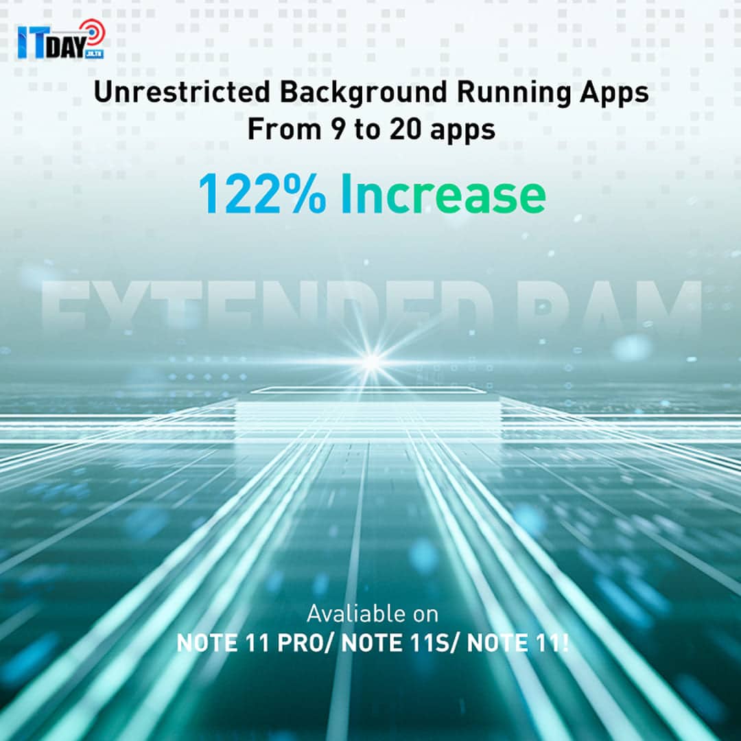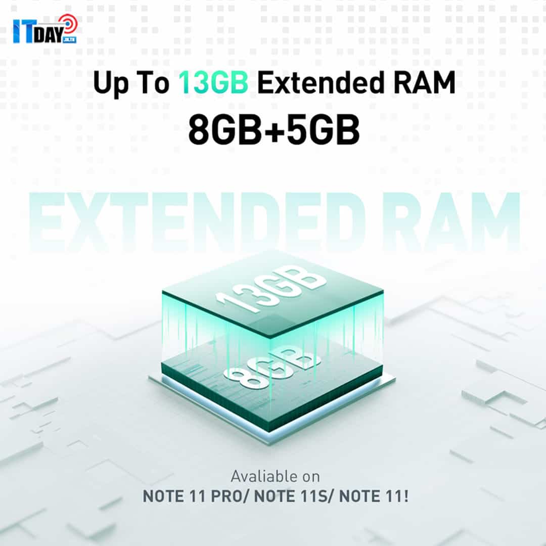 ฟีเจอร์ Extended RAM ของ NOTE 11 จะพร้อมใช้งานใน NOTE 11 Pro / NOTE 11S / NOTE 11 เมื่อเปิดใช้งาน Extended RAM โทรศัพท์สามารถโหลดเกมได้เร็วยิ่งขึ้น และมั่นใจได้ว่าผู้ใช้สามารถเริ่มเล่นเกมได้ทันที แม้ว่าจะสลับไปมาระหว่างแอพหลายตัว