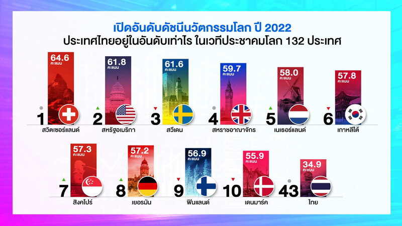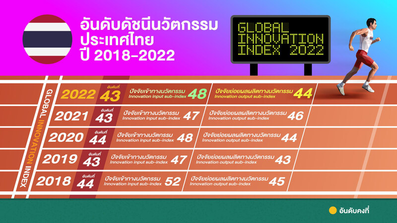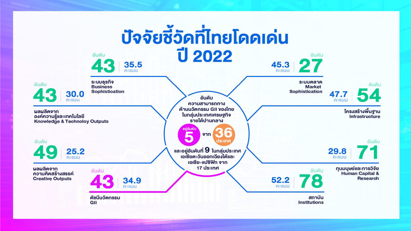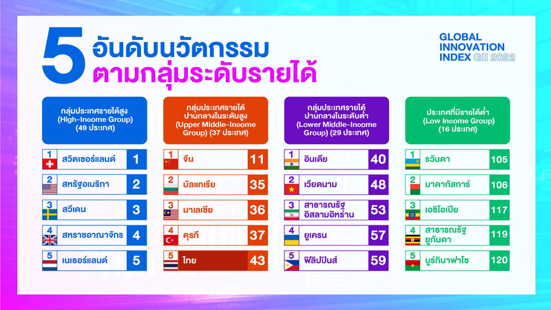 ตกรรมโลก ประจำปี 2565 (Global Innovation Index 2022 : GII 2022) ภายใต้ธีมอนาคตของการเติบโตด้ วยการขับเคลื่อนบนฐานนวัตกรรมคื ออะไร (What is the future of innovation-driven growth?) ซึ่งจัดโดยองค์การทรัพย์สิ นทางปัญญาแห่งโลก (WIPO) เพื่อวัดระดับความสามารถทางด้ านนวัตกรรม ของประเทศกว่า 130 ประเทศทั่วโลก - นี้ประเทศไทยยังครองอั