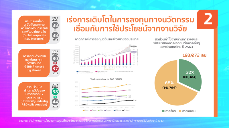 โดยเฉพาะในภาคเอกชนไทยที่มีสัดส่วนการลงทุนสูงกว่าหน่วยงานภาครัฐอย่างโดดเด่น ดังนั้น หากเร่งส่งเสริมให้เกิดความร่วมมือระหว่างภาคการศึกษาและภาคอุตสาหกรรมจะช่วยเร่งการเติบโต การใช้ประโยชน์ การลงทุน และการถ่ายทอดองค์ความรู้ด้านวิจัยและพัฒนาจากต่างประเทศ เพื่อสร้างผลผลิตทางนวัตกรรมที่ตอบโจทย์ความต้องการของตลาดโลก