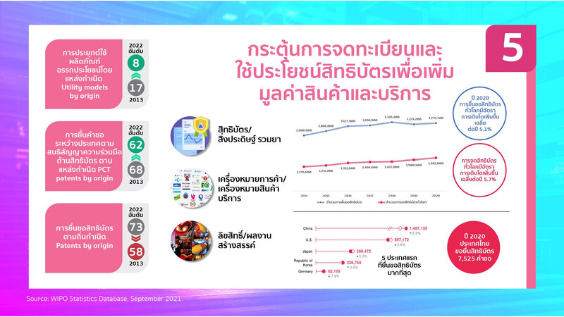 ประเทศไทยมีการยื่นจดผลิตภัณฑ์อรรถประโยชน์ หรืออนุสิทธิบัตรสูงเป็นอันดับ 8 ของโลก แต่นวัตกรรมที่เกิดขึ้นเป็นแบบค่อยเป็นค่อยไป ระดับการพัฒนาเทคโนโลยีไม่สูงมากนัก จึงต้องพัฒนานโยบายเชิงรุกด้านการลงทุน และการคุ้มครองสิทธิในทรัพย์สินทางปัญญา เพื่อนำไปสู่การสร้างองค์ความรู้ใหม่ในประเทศ