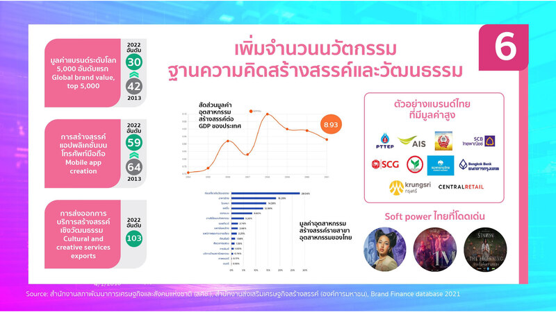 ซึ่งถือเป็นทรัพยากรที่สามารถนำไปสู่นวัตกรรมที่หลากหลาย สามารถสอดแทรกไปในหลายอุตสาหกรรม เช่น ท่องเที่ยว อาหาร แฟชั่น บันเทิง ฯลฯ ทั้งนี้ การนำพลังอำนาจอ่อน (Soft Power) มาพัฒนาอุตสาหกรรม และทำให้เกิดการสร้างแบรด์ระดับโลกมีปรากฏให้เห็นในหลายประเทศ