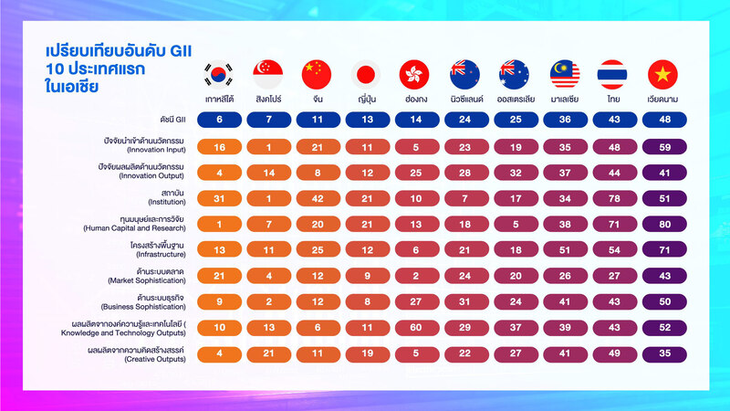 โดยในปีนี้ปัจจัยย่อยผลผลิตทางนวัตกรรม (Innovation output sub-index) อันดับที่ 44 (ดีขึ้น 2 อันดับ) ขณะที่ฝั่งปัจจัยเข้าทางนวัตกรรม (Innovation input sub-index) อันดับที่ 48 (ลดลง 1 อันดับ)