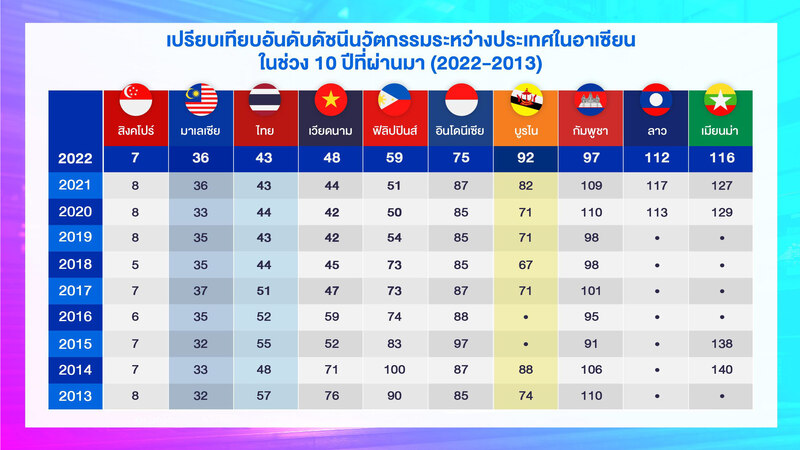 นดับที่ 43 (ปี 2021 อันดับ 43) ถือเป็นอันดับ 3 ในอาเซียนรองจากสิงคโปร์ อันดับ 7 และมาเลเซีย อันดับ 36 โดยปัจจัยสัดส่วนค่าใช้จ่ ายมวลรวมด้านวิจัย และพัฒนาที่ ลงทุนโดยองค์กรธุรกิจ และปัจจัยสัดส่วนการส่งออกสินค้ าสร้างสรรค์เป็นอันดับ 1 ของโลก สำหรับปีนี้สาธารณรัฐสังคมนิยมเ วียดนามอยู่ในอันดับ 48