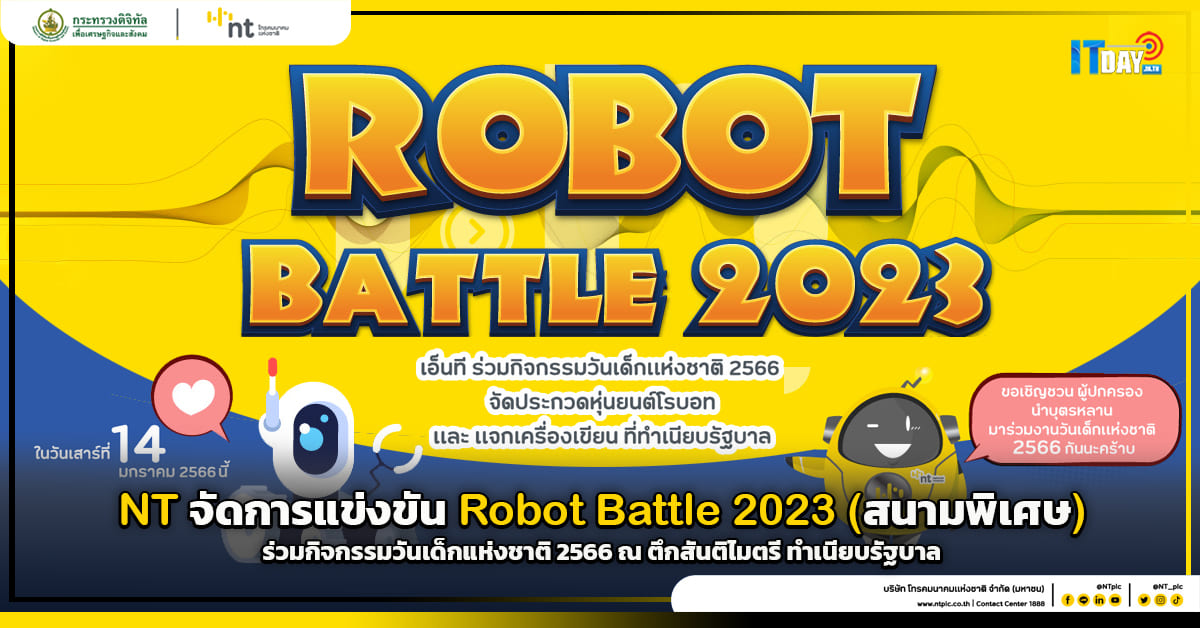 เอ็นที (NT) จัดการแข่งขัน Robot Battle 2023 (สนามพิเศษ) ร่วมกิจกรรมวันเด็กแห่งชาติ 2566 ชิงถ้วยรางวัลชนะเลิศจากนายกรัฐมนตรี ณ ตึกสันติไมตรี ทำเนียบรัฐบาล…