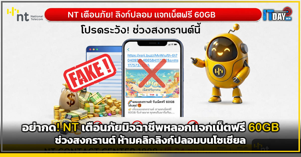 อย่ากด! NT เตือนภัยมิจฉาชีพหลอกแจกเน็ตฟรี 60GB ช่วงสงกรานต์ ห้ามคลิกลิงก์ปลอมบนโซเชียล