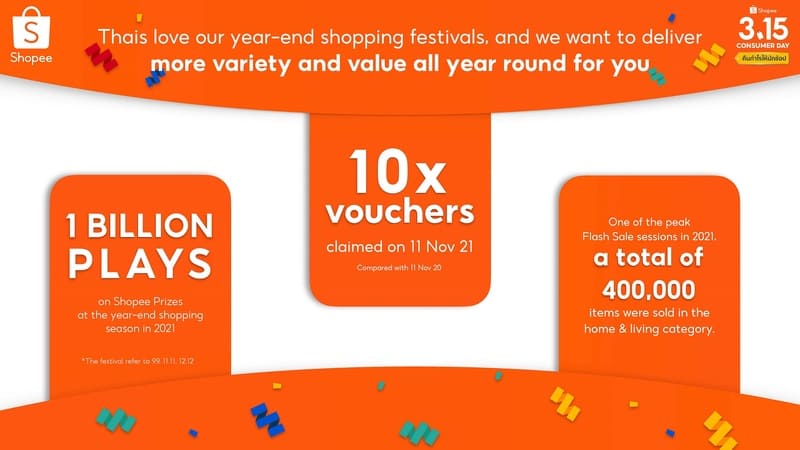 ปัจจุบันนี้ผู้คนหันมาช้อปออนไลน์มากขึ้น และเทศกาลช้อปปิ้งปลายปีได้รับความนิยมมาก เราจึงได้เปิดตัว ช้อปปี้ 3.15 Consumer Day เพื่อสร้างสีสันแบบเดียวกันในช่วงต้นปี เรารู้สึกตื่นเต้นที่ได้เปิดตัว ช้อปปี้ 3.15 Consumer Day เป็นครั้งแรก และหวังว่าแคมเปญนี้จะสร้างความสุขให้กับทุกคน
