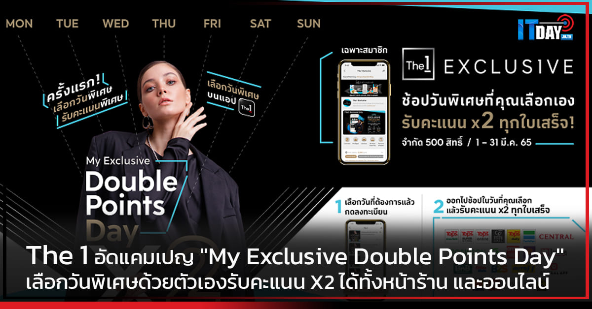 เดอะวัน ผู้นำดิจิทัลไลฟ์สไตล์ และลอยัลตี้แพลตฟอร์มอันดับ 1 ของไทย ภายใต้กลุ่มเซ็นทรัล เปิดตัวแคมเปญใหม่ล่าสุด “My Exclusive Double Points Day“ ครั้งแรกที่สิทธิ์การเลือกวันช้อปสนุกรับพอยท์คูณสองจะมาอยู่ในมือของสมาชิก เดอะวัน เอ็กซ์คลูซีฟ (The 1 Exclusive) ที่มีแอป เดอะวัน เท่านั้น!