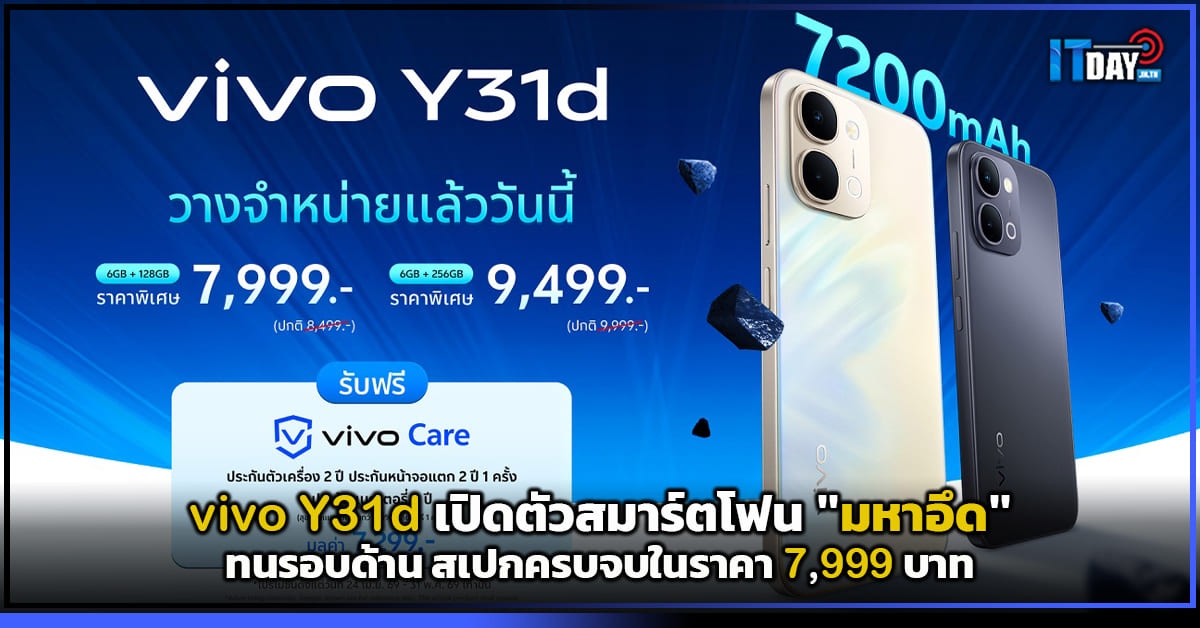 ครบคุ้มในเครื่องเดียว! vivo Y31d สมาร์ตโฟนสายลุย แบตอึด ดีไซน์แกร่ง พร้อมขายแล้ววันนี้ เริ่มต้น 7,999 บาท…